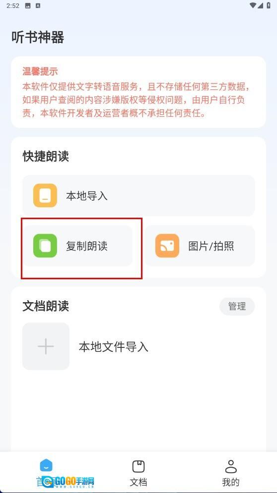 1、点击【复制朗读】功能按钮,即可进入文字输入页面。