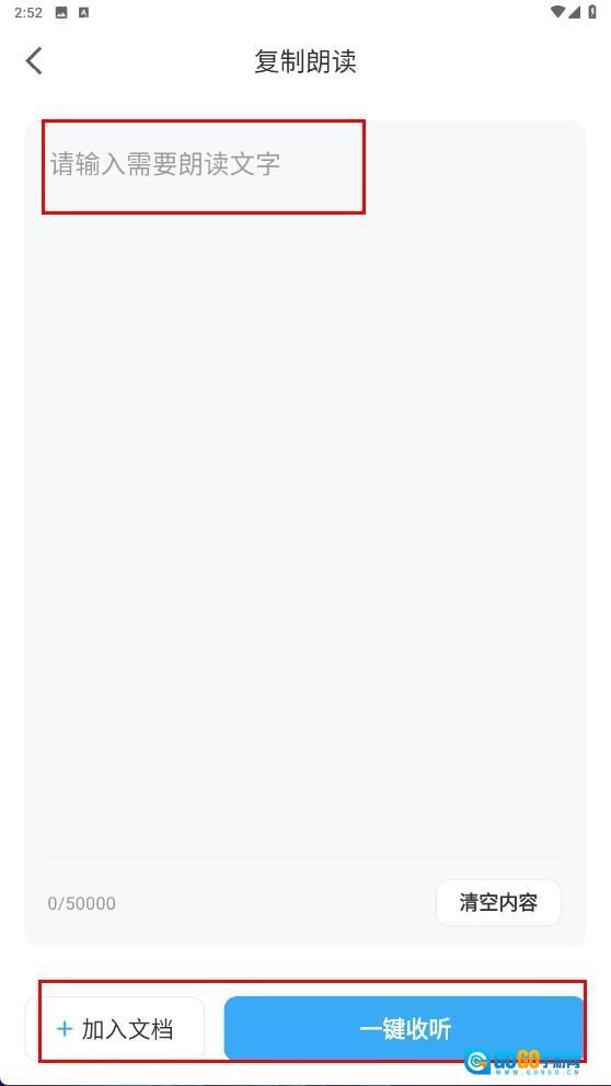 2、在输入框中输入想要朗读的文字后,可以选择【加入文档】,再点击【一键收听】按钮。