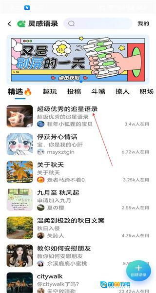 打开软件后进入精选界面,能看到超级优秀的追星语录等多种分类,点击超级优秀的追星语录即可进入对应的详情页面。