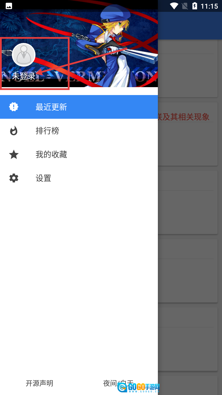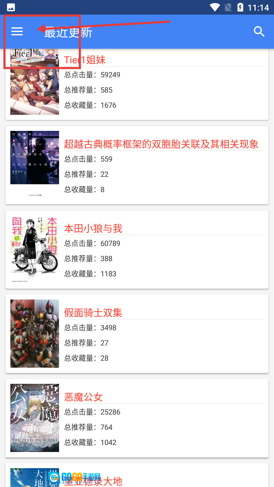 1、进入“最近更新”页面后,点击左上角的【三】横线菜单按钮,就能展开侧边栏,进而查看排行榜、我的收藏等功能选项。