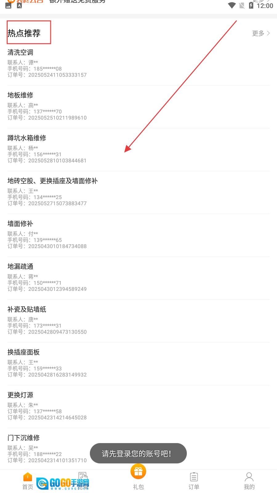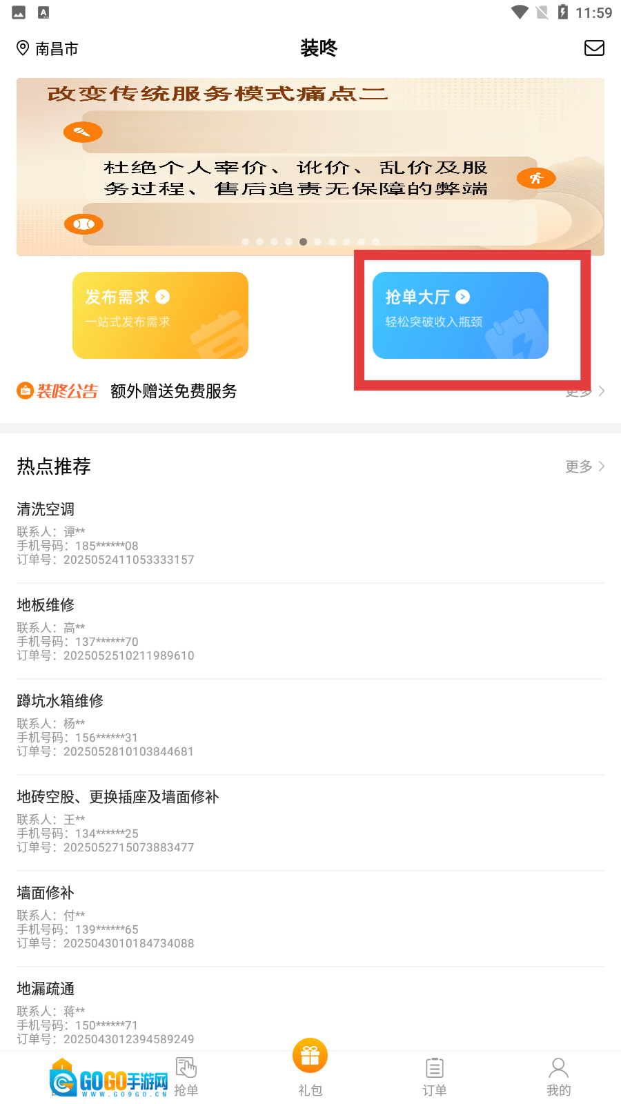 4、在首页的【热点推荐】板块中,能够查看各类装修维修订单的相关信息,登录账号后即可参与抢单操作。