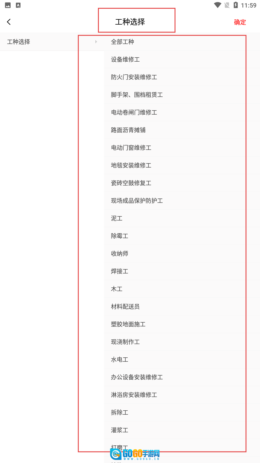 2、进入抢单页面后,挑选对应的工种(像水电工、木工这类),然后点击“确定”按钮。