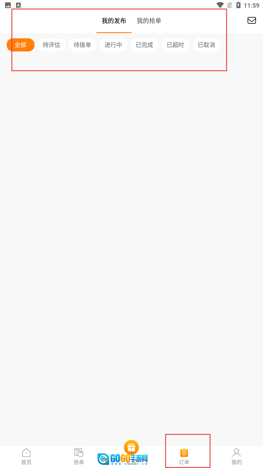 3、点击底部的【订单】按钮,就能查看“我的发布”与“我的抢单”的订单状态,比如进行中、已完成之类的。