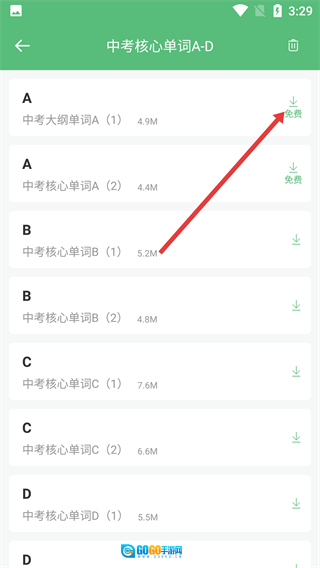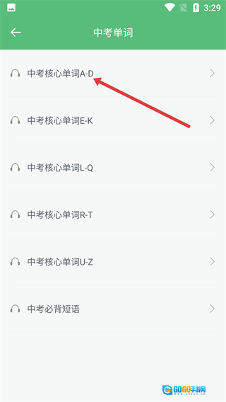 3、在中考单词分类页面点击【中考核心单词A-D】,即可进入该范围的单词列表页面。