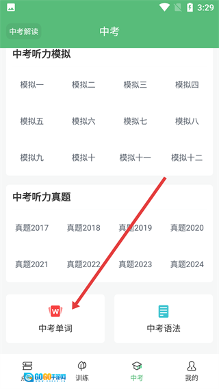 2、在中考板块页面点击【中考单词】,进入中考单词分类页面后,就能选择不同范围的单词来开展学习。