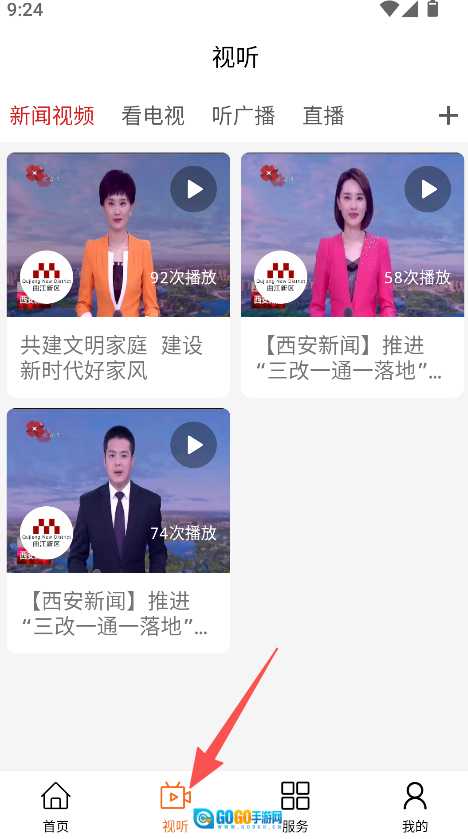 1、进入视听板块,找到新闻视频分类,观看视频并进行点赞、评论等互动操作。