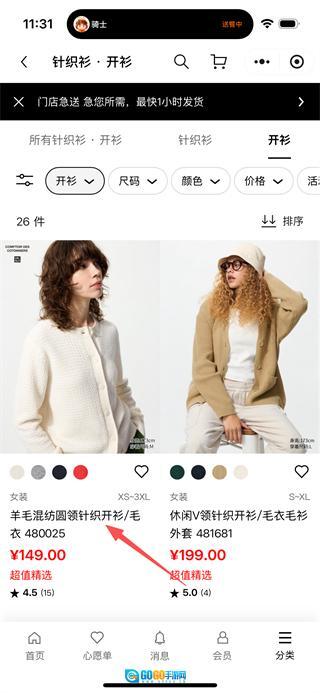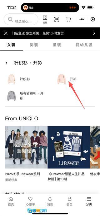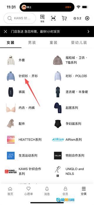 在商品分类页面,点击“针织衫开衫”选项,即可进入针织衫·开衫的分类页面。