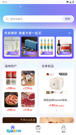 首页设有热卖爆款、道地特产、当地新品等板块。