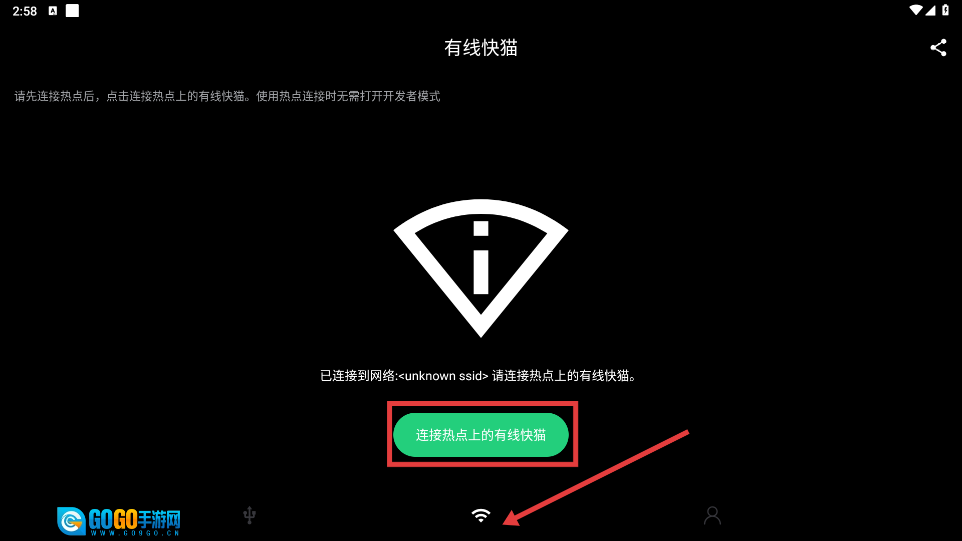 3、连接热点后,点击【连接热点上的有线快猫】按钮,完成网络连接操作。