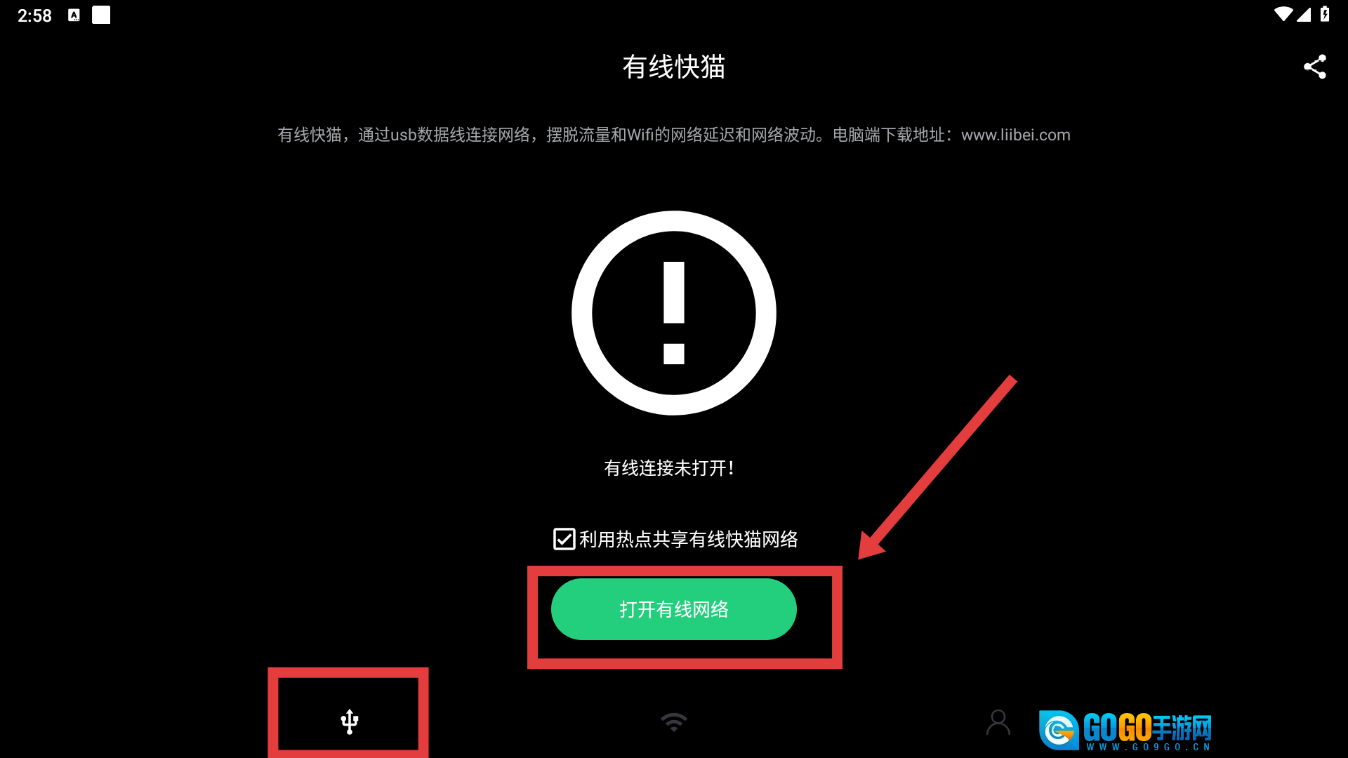 2、进入【有线快猫-页面】后,点击【打开有线网络-按钮】,尝试启用有线连接。