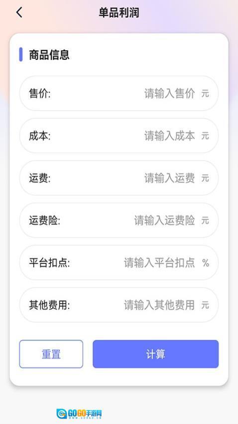 2、计算单品利润时,只需输入售价、成本、运费及其他费用即可完成计算。