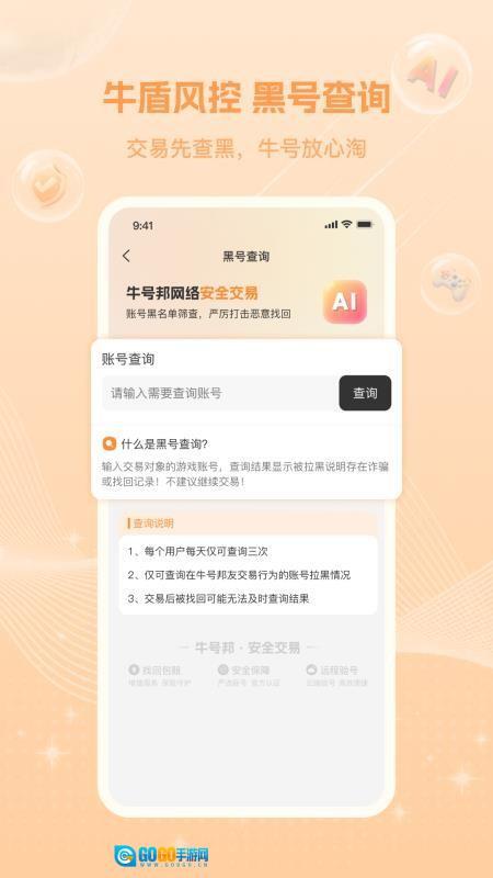 牛号邦助力用户便捷完成游戏账号交易,支持随时进行账号买卖,确保交易安全合规;平台覆盖海量账号资源,交易流程高效快捷,还能轻松完成账号验号操作,一键识别绑定关联的连体账号,为用户提供专属担保服务,让交易更安心、更省心。