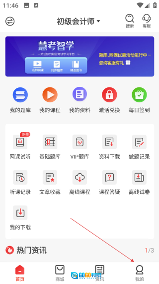 1、打开初级会计师应用后,在首页底部找到【我的】按钮并点击,即可进入个人中心的功能操作界面。