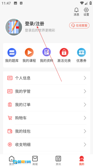 2、进入个人中心后,点击【登录/注册】按钮,即可进入账号登录的方式选择页面。