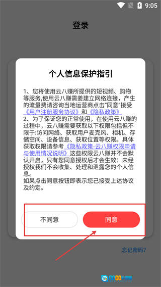 进入界面后会弹出《个人信息保护指引》,需要了解《云八赚》的服务协议与权限申请内容,确认无误后点击“同意”按钮以继续操作。