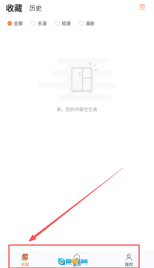 4、管理个人内容的话,点击底部的“我的”,就能查看收藏和历史记录,还能把喜欢的漫画添加到书架,这样下次阅读起来会更方便。