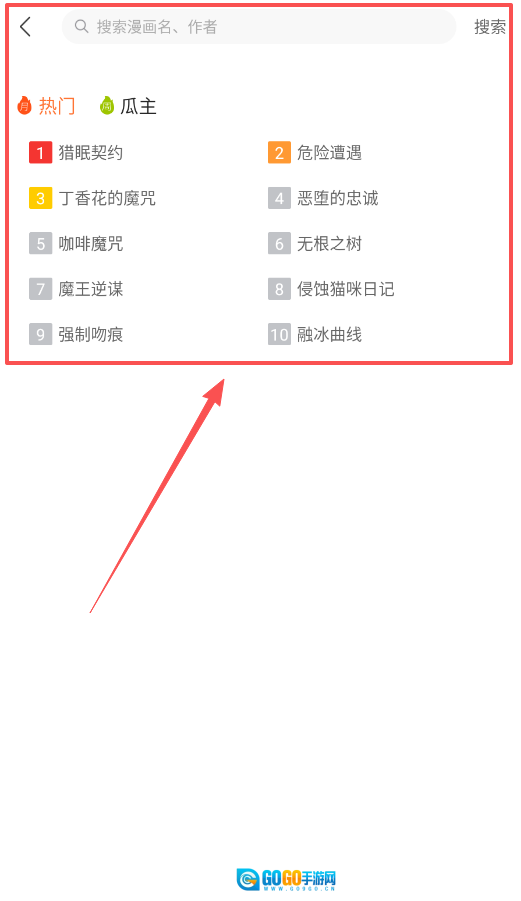 3、若想查找特定作品,可使用搜索功能:点击顶部的搜索框,输入漫画名称或作者姓名,也可以直接点击下方的热门搜索词条,这样就能快速定位到目标内容。