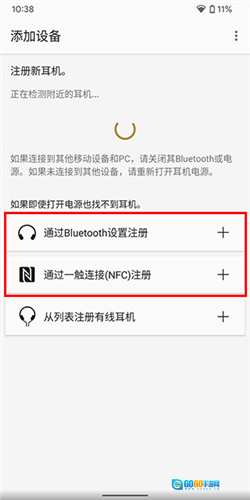 2、要是此时打开电源软件却检测不到耳机,那我们可以选择通过Bluetooth设置进行注册,或者使用下方的一触连接(该功能需要手机支持NFC)来手动连接耳机。