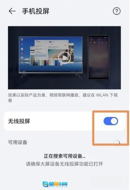 第三步:打开【无线投屏】后的蓝色开关即可搜索设备连接进行投屏