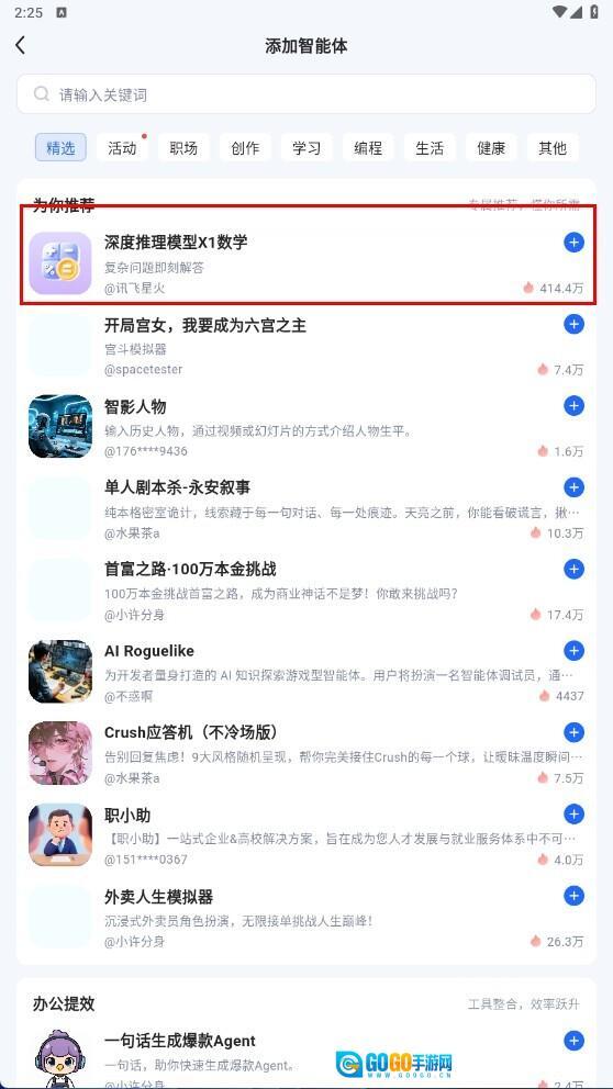 3、进入添加智能体的页面后,挑选需要使用的智能体(比如【深度推理模型X1数学-智能体】)来完成添加操作。
