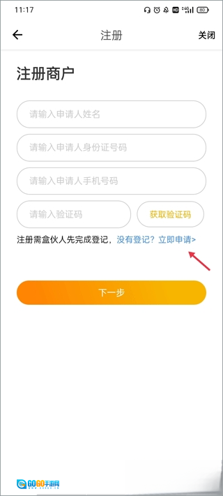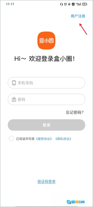 1、打开软件后页面会直接跳转至登录界面,此时点击界面右上角的“商户注册”按钮即可。