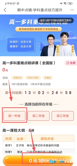3、选择对应年级后点击0元领取,获取免费课程资源。