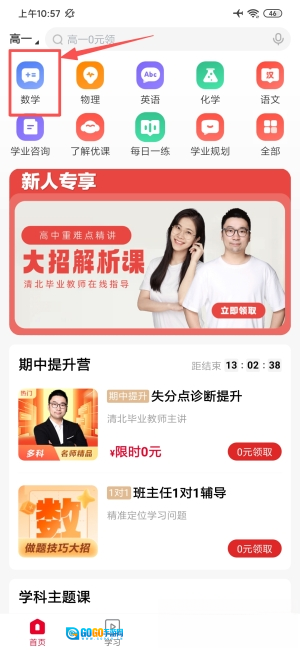 2、于首页选择"数学"学科,进入课程分类页面。