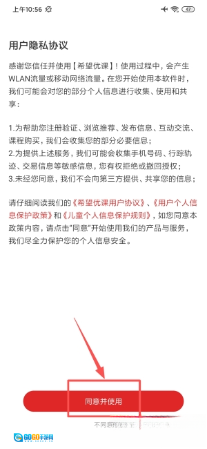 1、在用户隐私协议界面点击"同意并使用",即可进入应用。