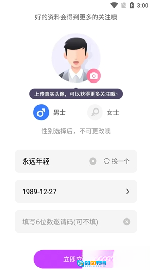2、在完善资料界面完善你的详细资料,点击立即交友,成功注册账号。