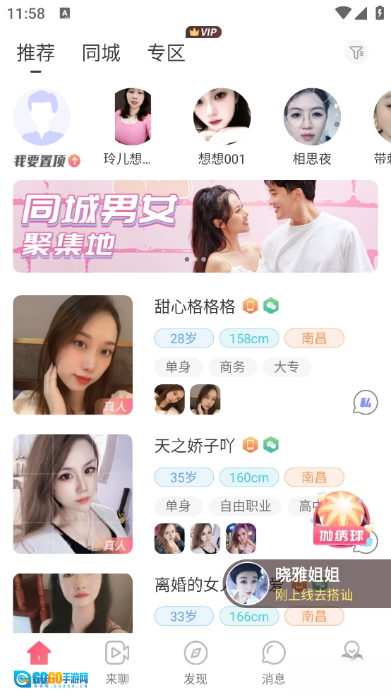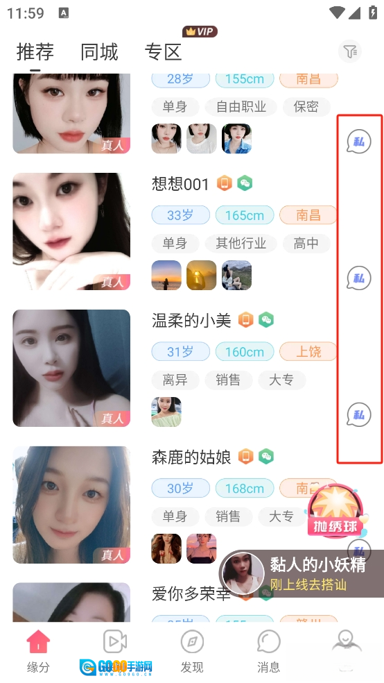 3、进入之后,如果你注册性别是男,那么可以看见有很多的女性用户,相反如果注册是女,会看见很多男性用户信息