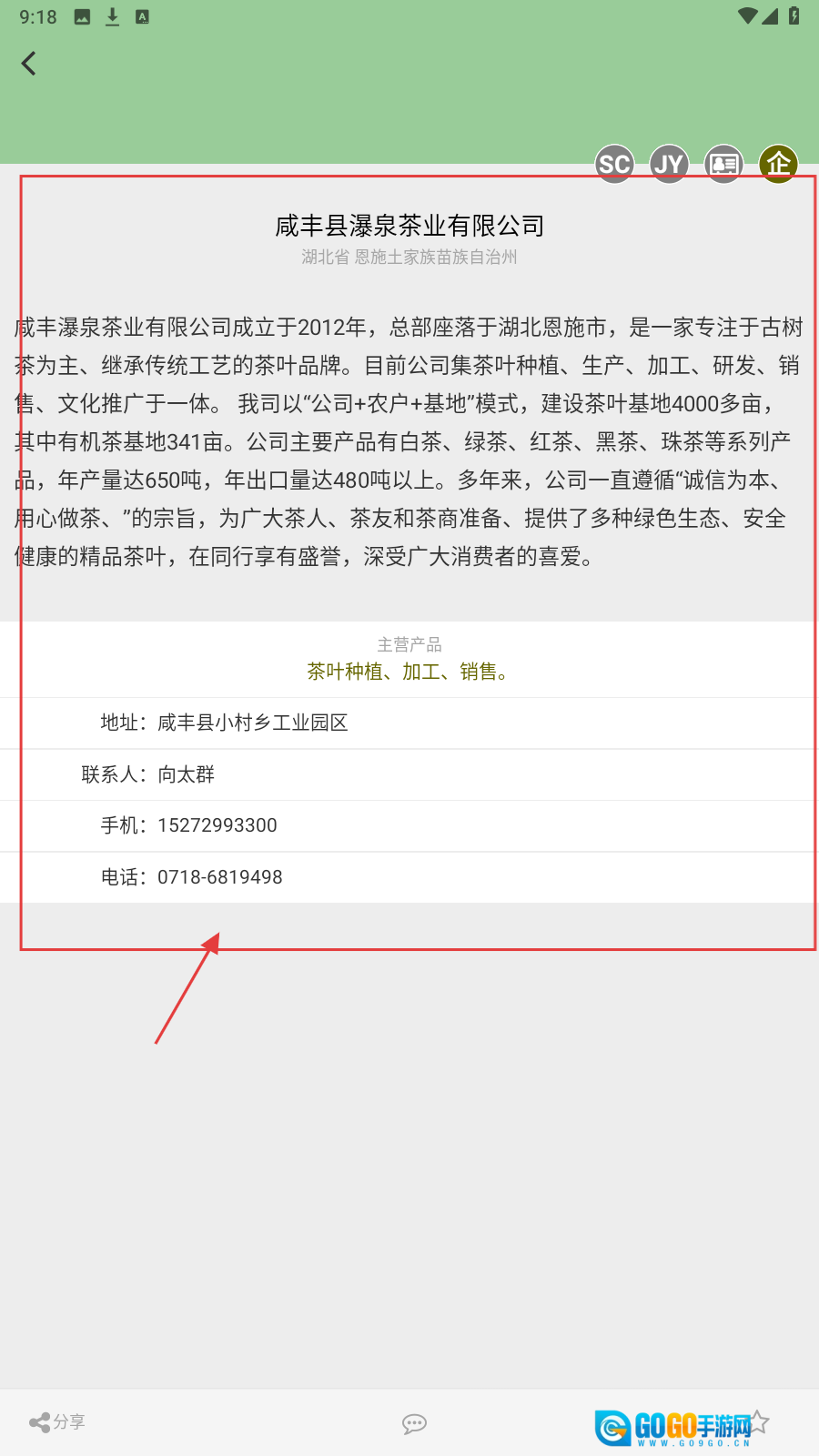 4、进入感兴趣的茶企详情页,了解茶企的详细信息,可以通过下方联系方式进行联系购买。