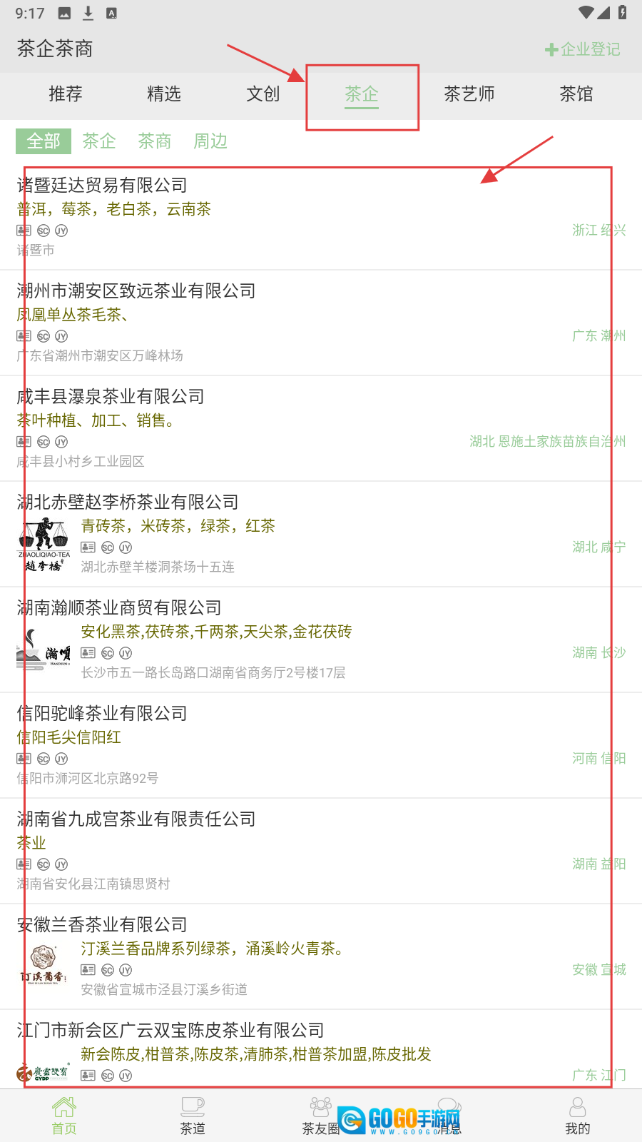 3、在上方点击【茶企】,查看茶企信息,了解各个茶企业务。