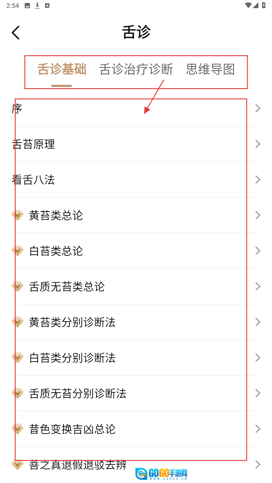 2、进【舌诊】页,按【舌诊基础】分类,如【舌苔原理】,深入了解。