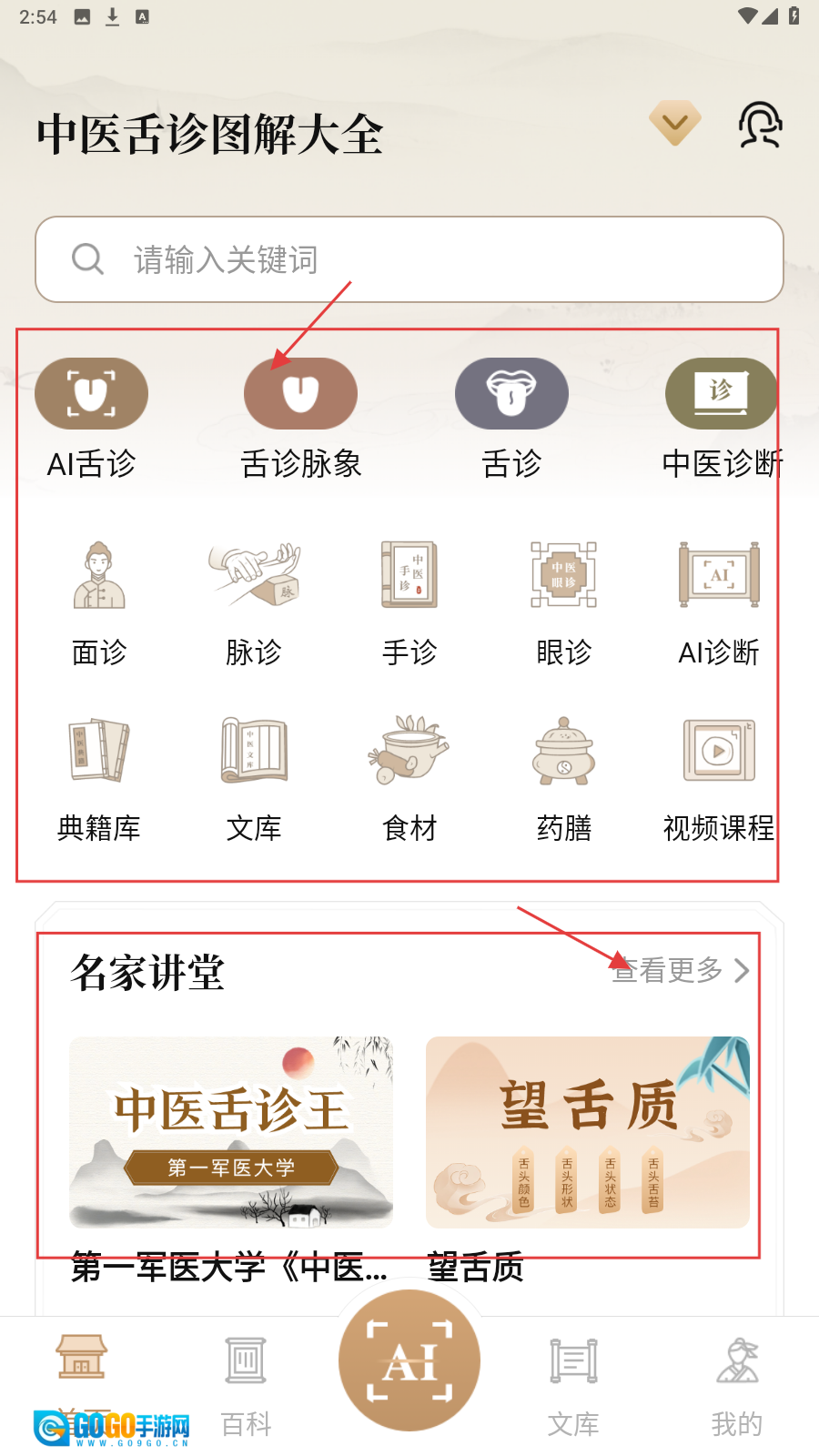1、首页选【舌诊脉象】等功能,点【名家讲堂】看课程,学中医知识。