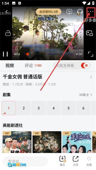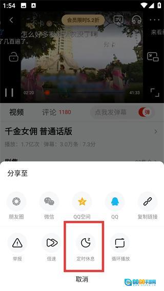 2、进入播放页面后,点击右上角的三点图标,会弹出功能菜单,之后就能找到定时休息等操作选项啦。