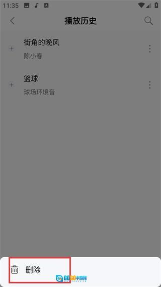 4、在操作菜单中找到【删除】选项并点击,即可把这首歌曲从播放历史里移除,完成播放记录的清理。