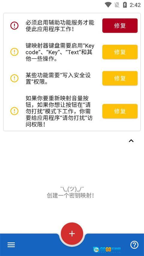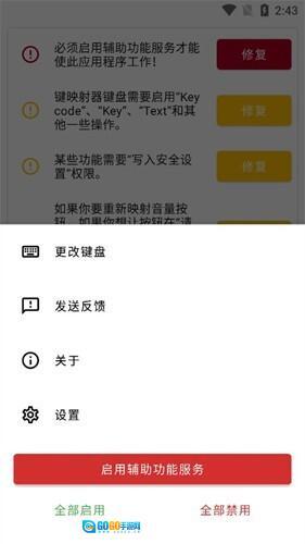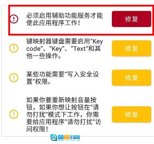 点击辅助功能服务提示旁的修复按钮,您就能授予键映射器运行辅助功能服务的权限。这是应用程序正常工作的必要操作。
