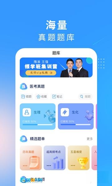 1、平台涵盖5000余道历年考试真题,依据生理、生化、病理等学科进行分类整理,所有真题内容均向用户免费开放使用。
