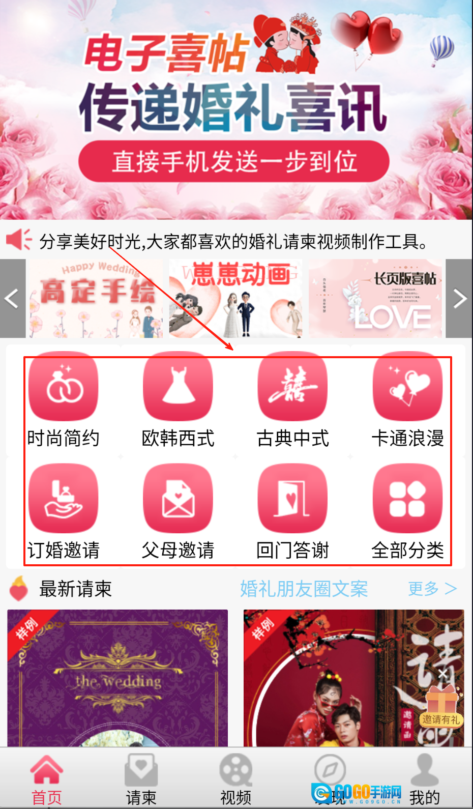 1、安装应用后选择需要的请柬类型,根据场景挑选对应模板进行创作。