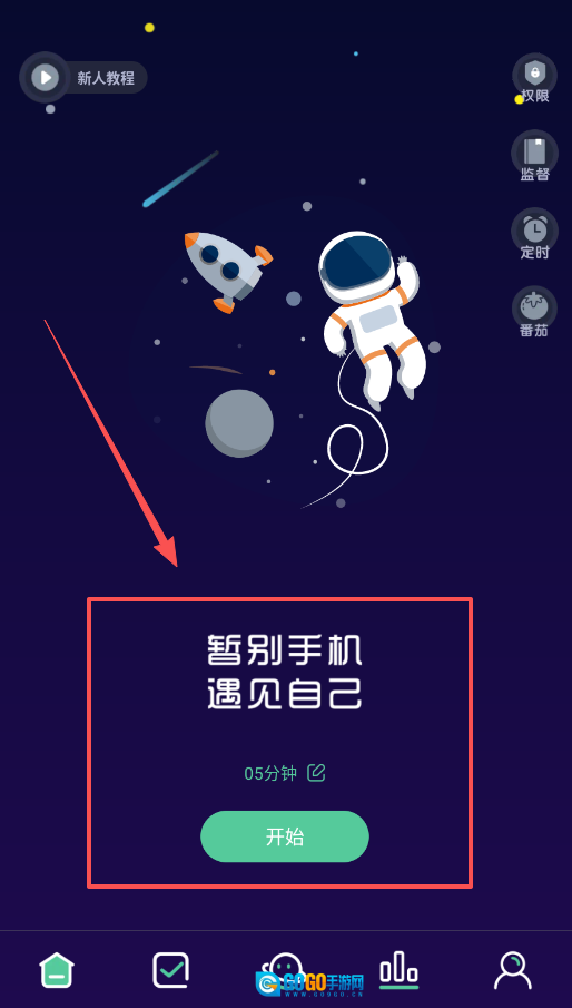 2、初次体验可借助“新人教程”,先设定一个短时间目标,比如5分钟,接着点击“开始”按钮。