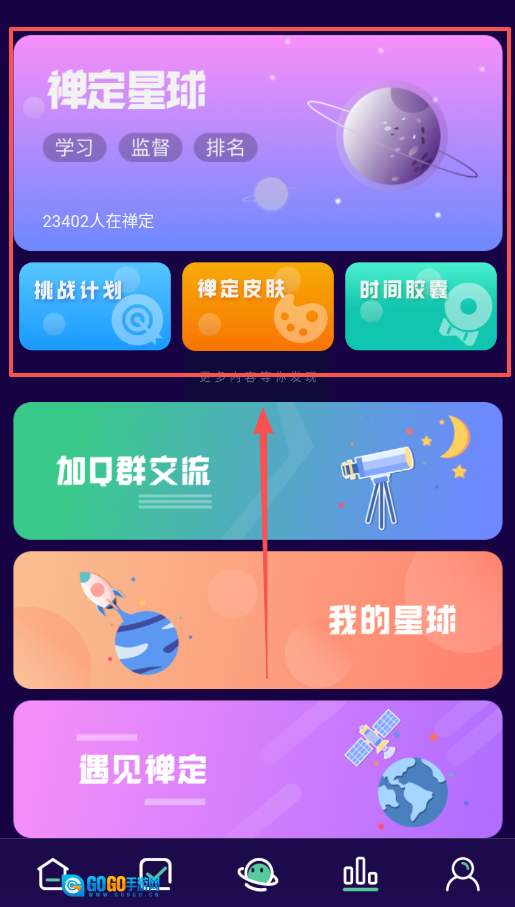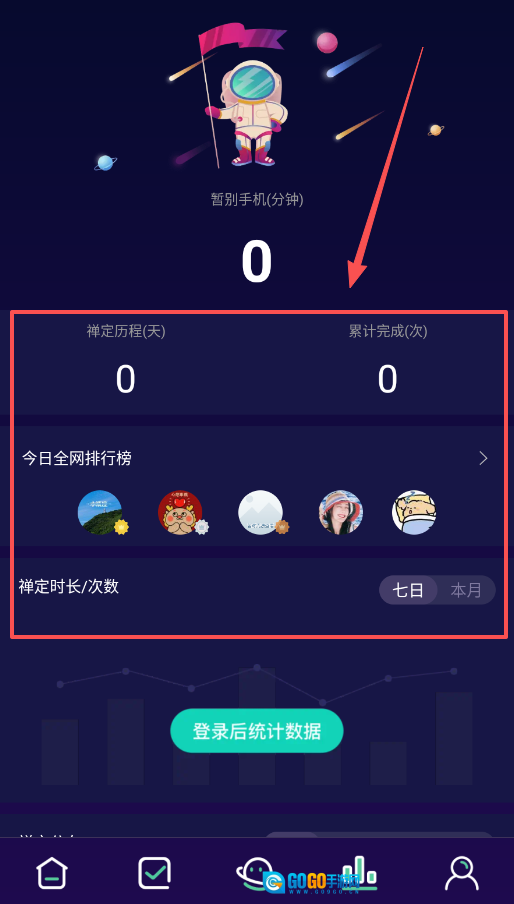 1、打开应用并完成登录,这样就能启用数据记录和排名功能,你自己的专属数据可以在“我的星球”页面进行查看。