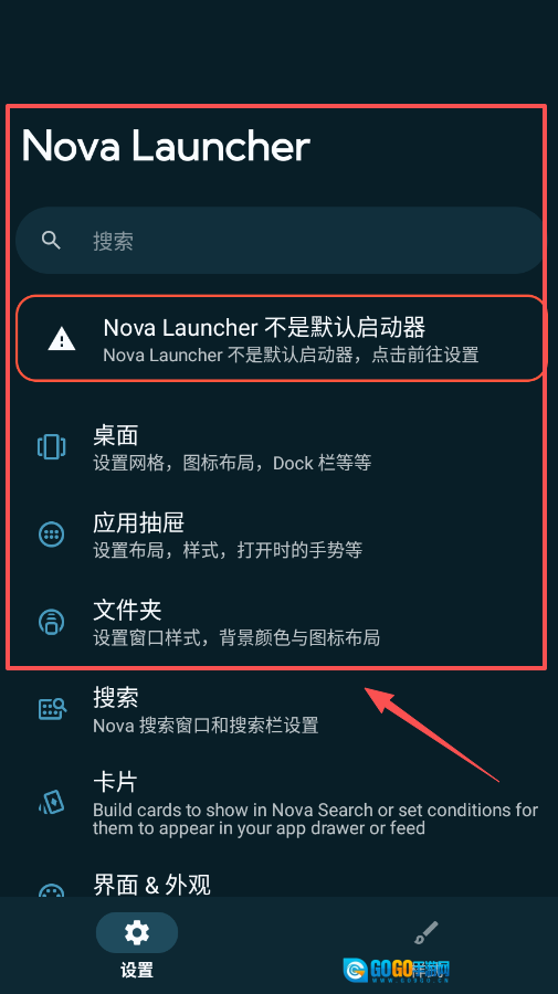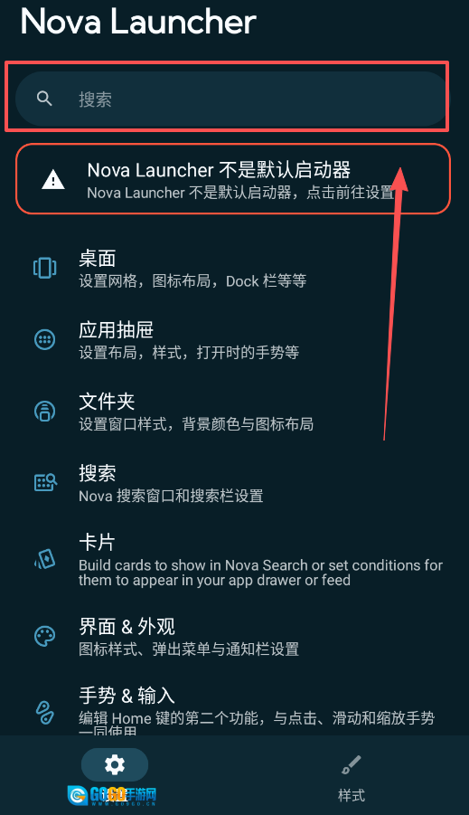 2、设置默认启动器挺重要的,要是看到“Nova Launcher 不是默认启动器”的提示,点一下那条提示就能跳转到系统设置页面了。