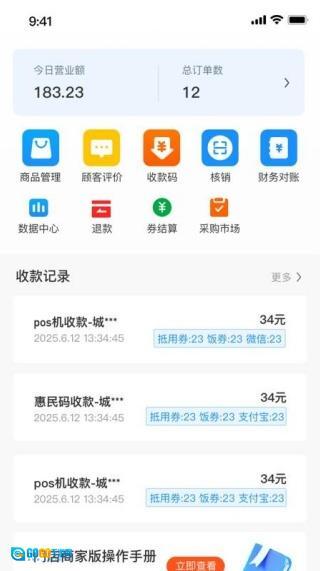 3. 在主页面就能看到今日营业额、总订单数、收款记录等数据。