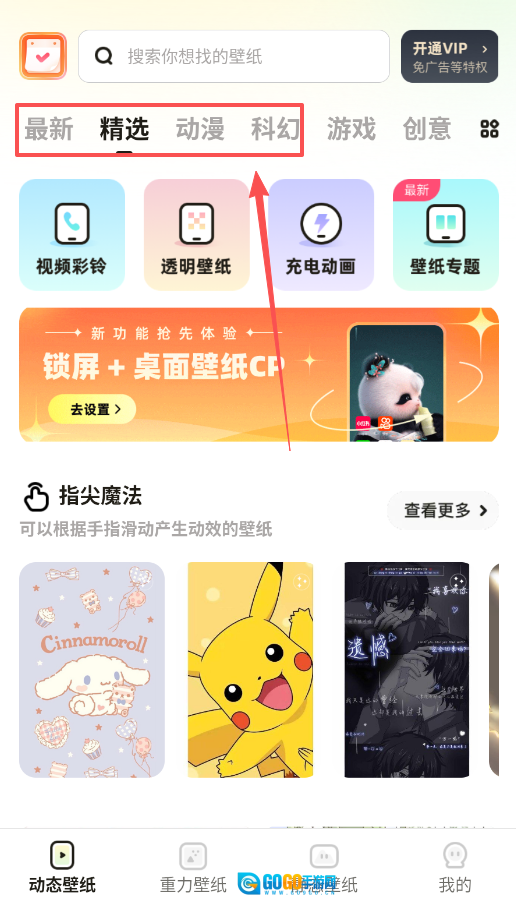 1、首先要做的是探索首页,顶部那些类似标签页的“精选、动漫、科幻”属于内容分类的入口,你可以从这里着手去寻找自己喜欢的风格。