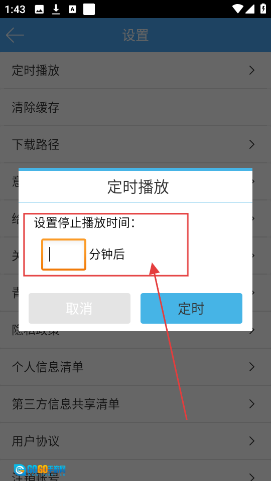 3、在定时播放设置页面,输入想要的停止播放时间,比如30分钟后,设置定时时间呢。