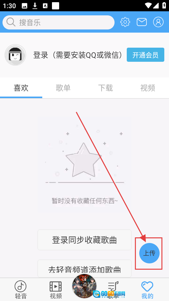 2、进入【我的】页面后,能看到【喜欢】【歌单】等标签,要是想上传内容,点击蓝色的【上传】按钮就可以啦。