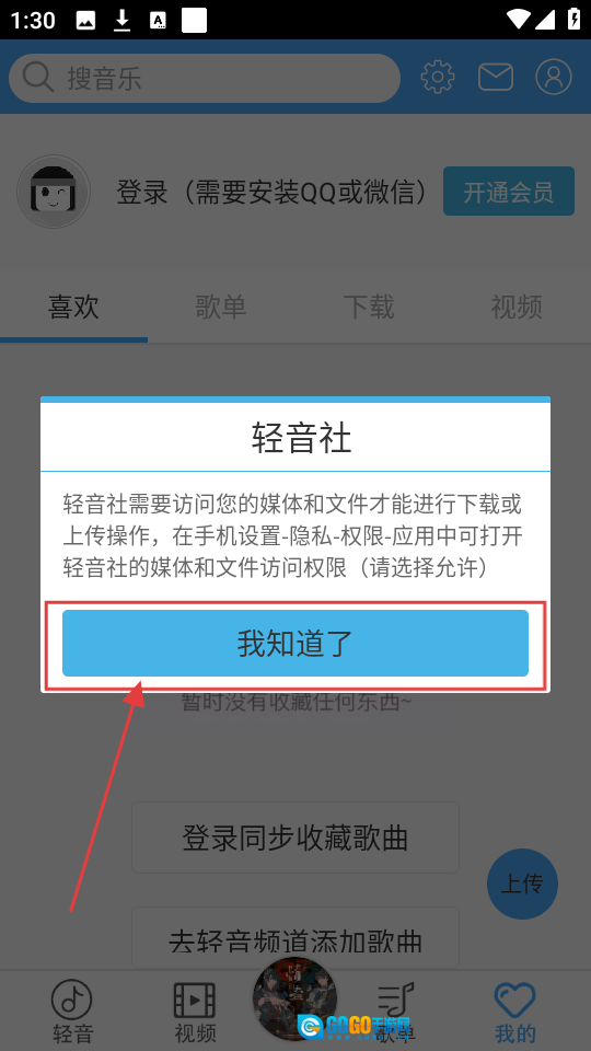 3、点击【上传】后,会弹出【轻音社】的权限提示框,阅读后点击【我知道了】,就能继续后续操作啦。