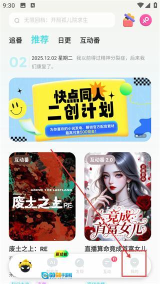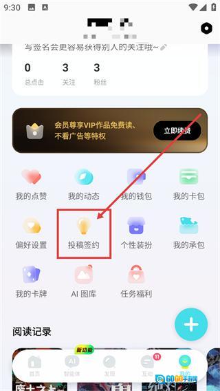 1、在推荐页点底部【我的】按钮能进入个人中心,后续可找到投稿签约等创作相关功能啦。