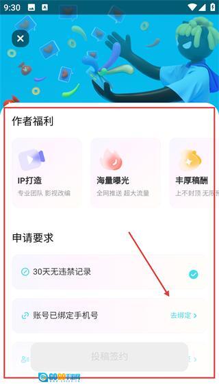 3、在投稿签约页,看到申请要求里需绑定手机号,点【去绑定】就能进入手机号绑定流程啦。