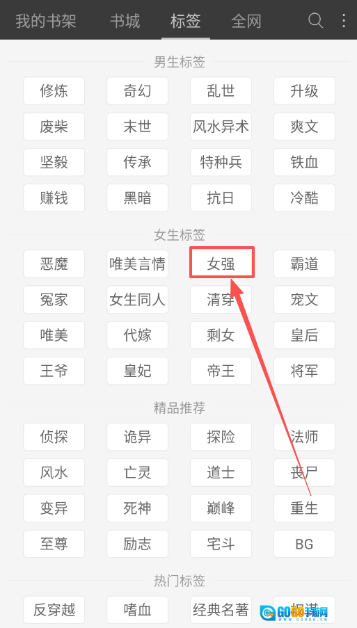 2、标签页包含“末世”“女强”“诡异”等丰富关键词,点击关键词就能筛选出对应作品,方便偏好清晰的用户使用。